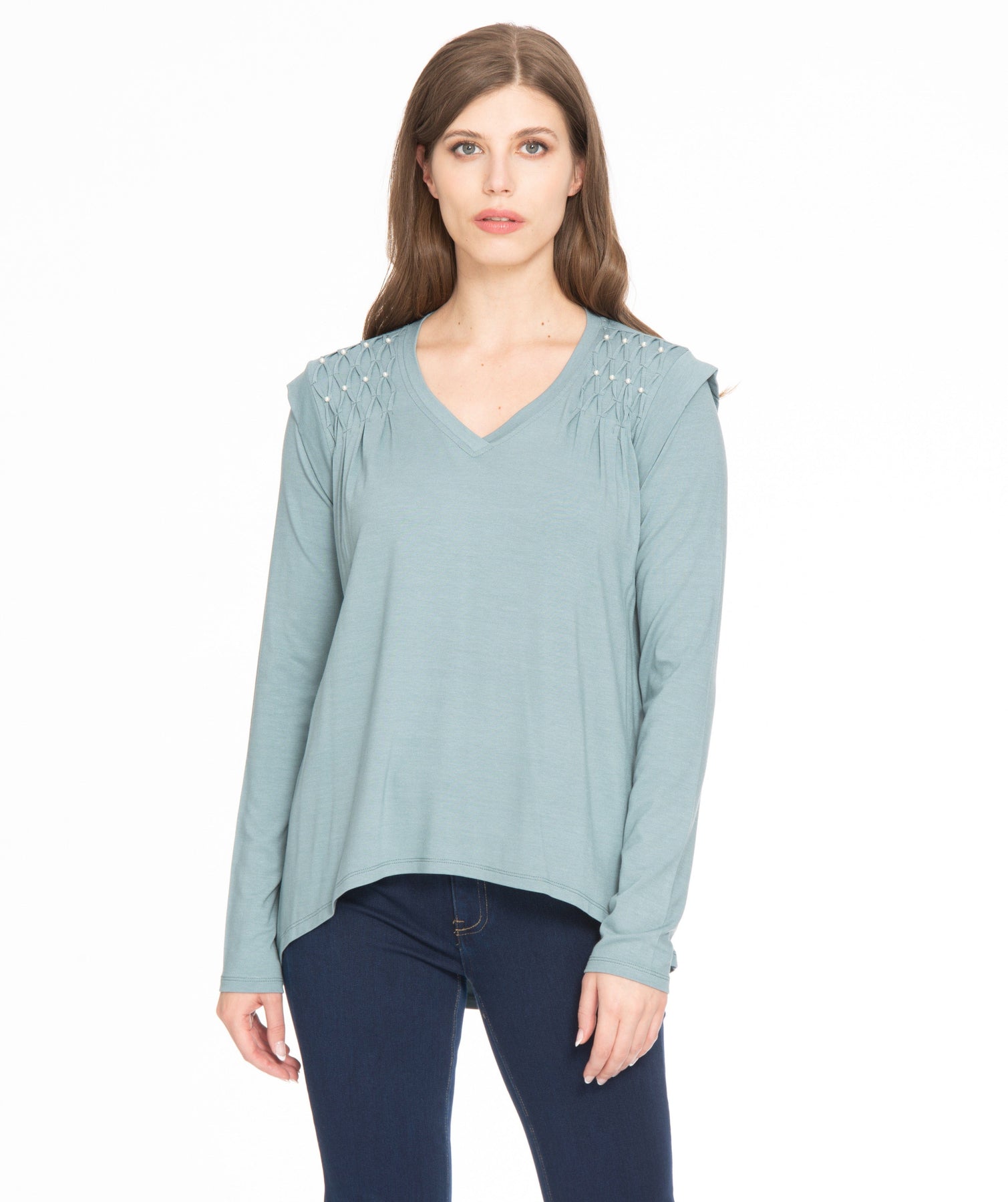 This Spense V-Neck Lace Trim Top is perfect for adding a touch of femininity to your wardrobe. The delicate lace trim adds a subtle elegance to the classic v-neck design. Made with high-quality materials, this top offers both style and comfort. Available in a variety of colours.